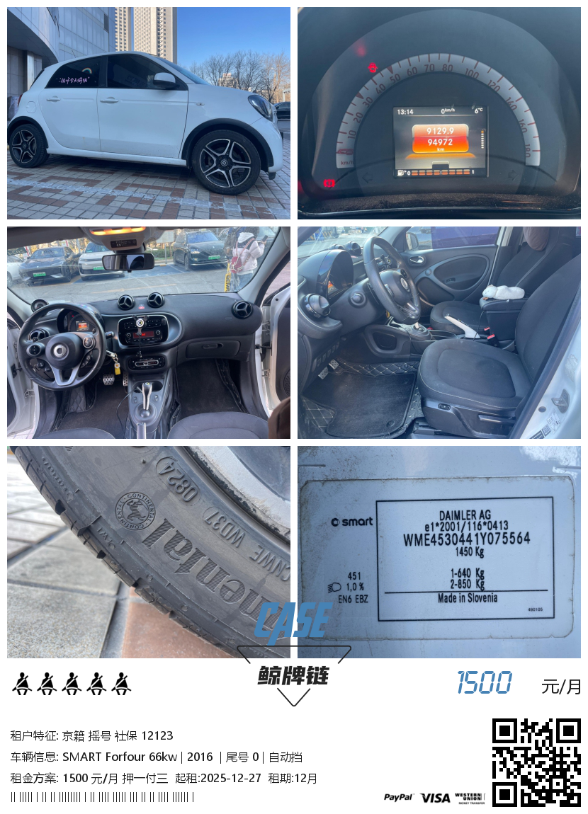 此车已租 租金 1500 元/月 支付 押一付三 品牌 SMART 型号 Forfour 66kw 动力 汽油 年份 2016 换挡 自动挡 里程 95000公里 起租 12月 尾号 0 产地 进口 保险 三者+车损+交强 停放 北京 更新 2025-12-22 12:39:05统计 83 车况良好,内饰整洁, 今年10月刚做保险,特别适合女士代步或通勤使用,小巧灵活。" 鲸牌链:闲置京牌车长租平台!Let me take you far away! You'd like a holiday! Powered by 鲸牌链