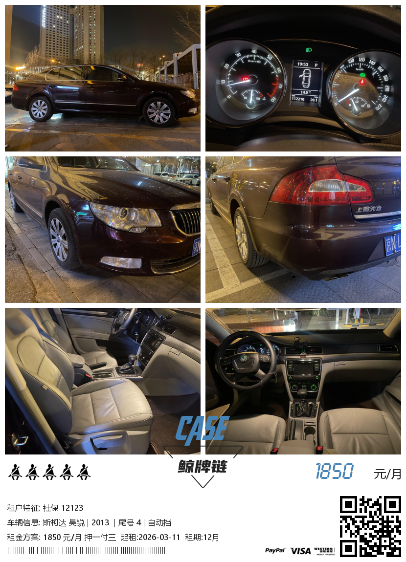 此车已租 租金 1850 元/月 支付 押一付三 品牌 斯柯达 型号 昊锐 动力 汽油 年份 2013 换挡 自动挡 里程 112000公里 起租 6月 尾号 4 产地 上海 保险 三者+车损+交强 停放 北京 更新 2026-01-19 09:55:05统计 90 私家自用车,车况良好,内饰整洁" 鲸牌链:闲置京牌车长租平台!Let me take you far away! You'd like a holiday! Powered by 鲸牌链