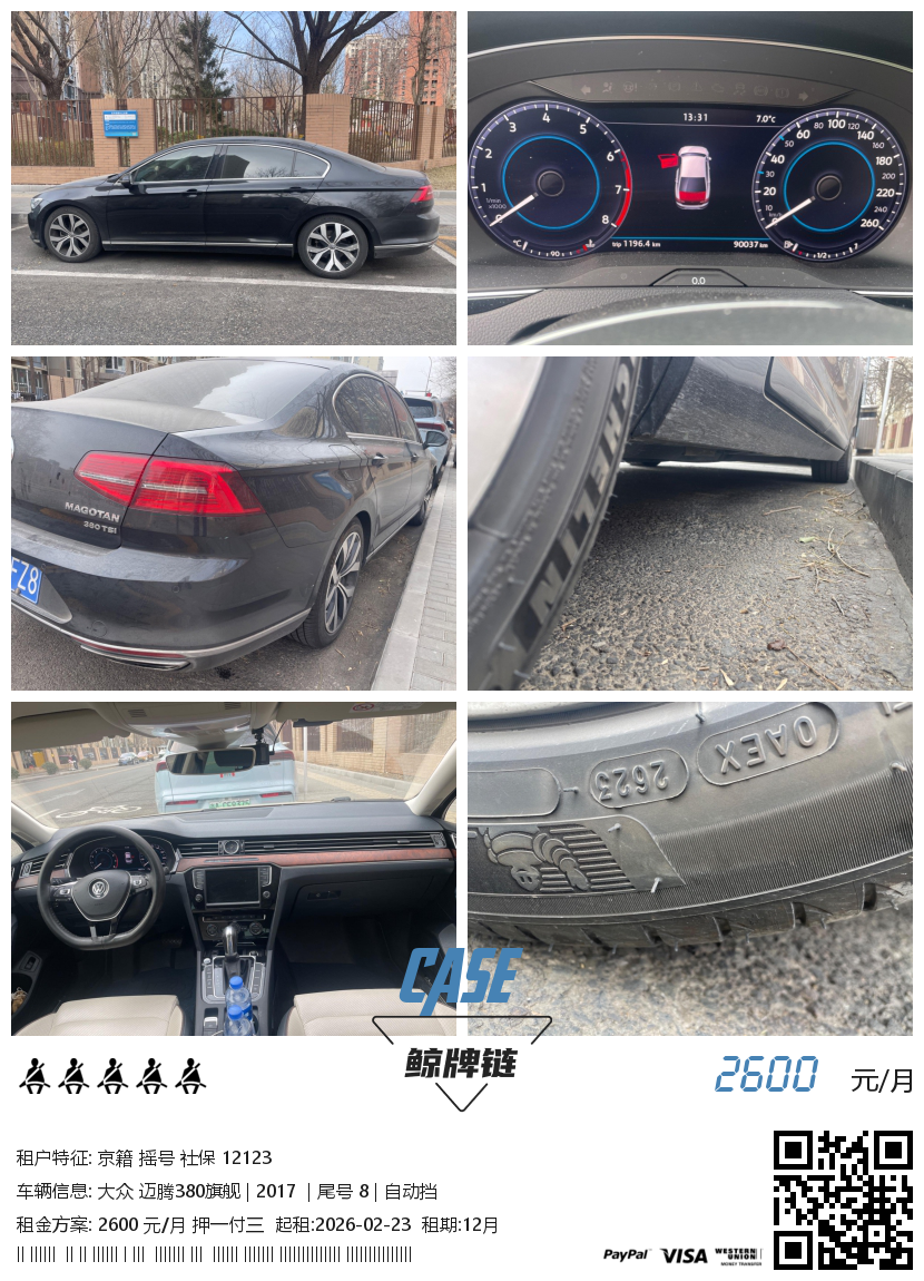 此车已租 租金 2600 元/月 支付 押一付三 品牌 大众 型号 迈腾380旗舰 动力 汽油 年份 2017 换挡 自动挡 里程 88800公里 起租 6月 尾号 8 产地 国产 保险 三者+车损+交强 停放 北京 更新 2026-02-11 10:00:47统计 49 车况良好,内饰整洁,迈腾顶配,丹拿音响,主驾按摩,抬头显示,座椅加热通风,带ACC,去年刚换了新胎。" 鲸牌链:闲置京牌车长租平台!Let me take you far away! You'd like a holiday! Powered by 鲸牌链