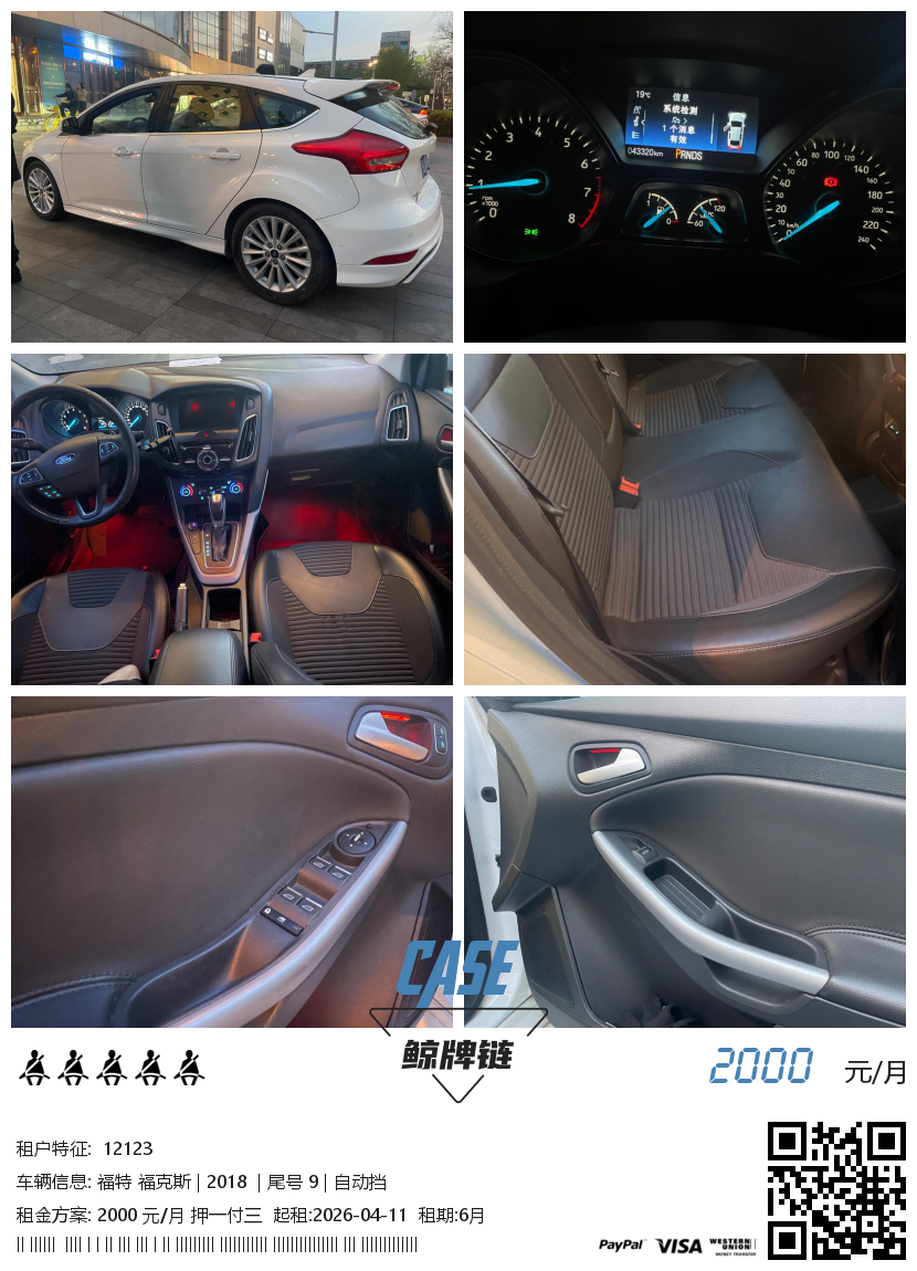 此车已租 租金 2000 元/月 支付 押一付三 品牌 福特 型号 福克斯 动力 汽油 年份 2018 换挡 自动挡 里程 42000公里 起租 6月 尾号 9 产地 进口 保险 三者+车损+交强 停放 北京 更新 2026-04-07 11:48:22统计 51 车况良好,内饰整洁" 鲸牌链:闲置京牌车长租平台!Let me take you far away! You'd like a holiday! Powered by 鲸牌链
