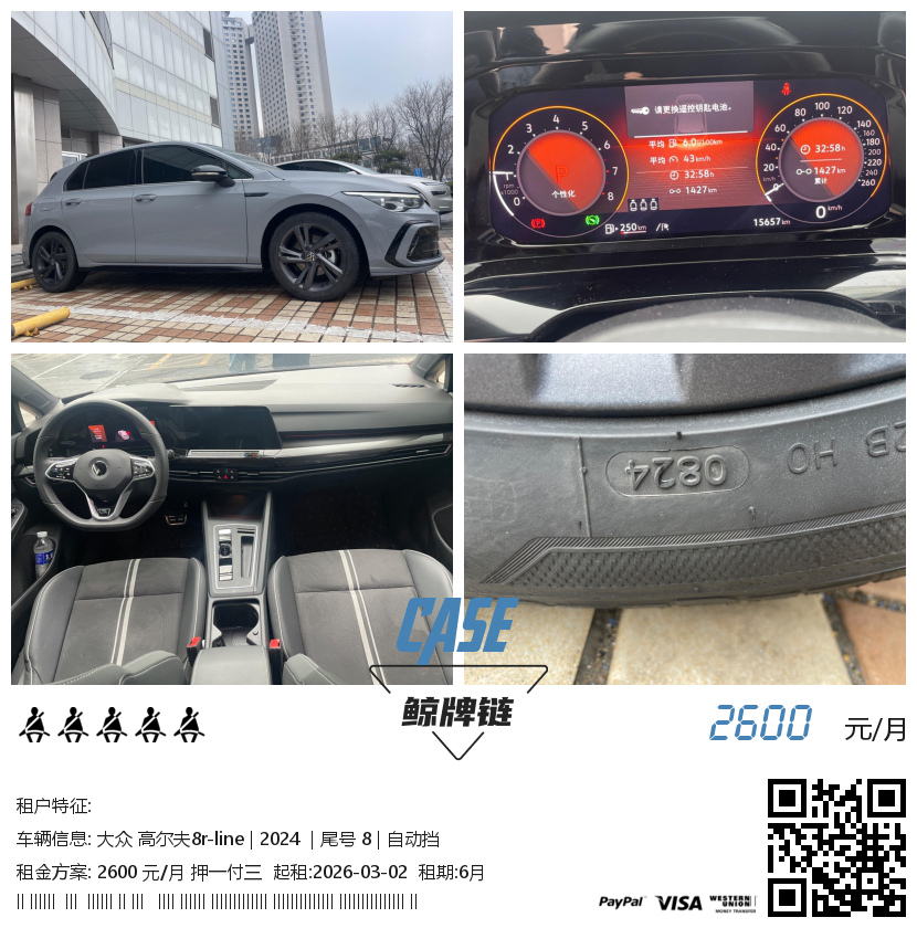 此车已租 租金 2600 元/月 支付 押一付三 品牌 大众 型号 高尔夫8r-line 动力 汽油 年份 2024 换挡 自动挡 里程 16000公里 起租 6月 尾号 8 产地 国产 保险 三者+车损+交强 停放 北京 更新 2026-02-27 20:42:12统计 92 车况良好,内饰整洁,无事故,8代高尔夫最高配" 鲸牌链:闲置京牌车长租平台!Let me take you far away! You'd like a holiday! Powered by 鲸牌链
